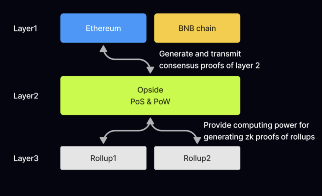 • L2, Opside Chain: Provide large-scale decentralized consensus, data availability, and ZKP computing power. All generated transactions and data will be packaged and stored on the L2 verification chain. The transaction speed is fast and the handling fee is low.